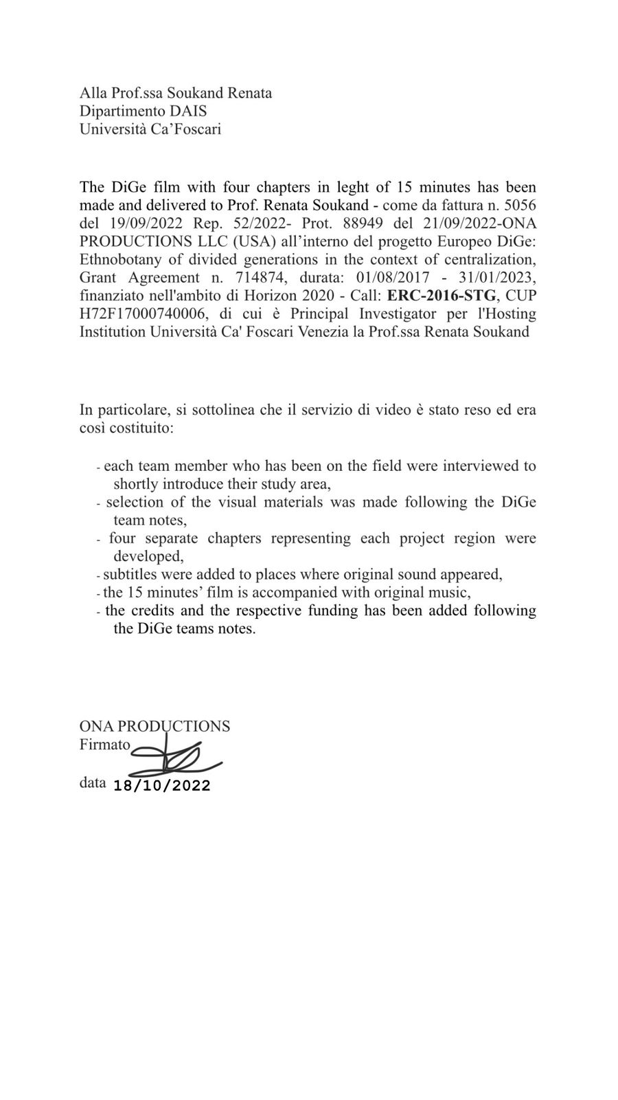 Attestazione di regolare servizio di ONA PRODUCTIONS LLC per produzione video progetto DIGE prof.ssa Soukand CIG: ZA837C693E