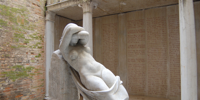 Il percorso  inizierà nel cortile del palazzo dove domina la scala fatta restaurare da Lady Helen D’Abernon e porterà alla scoperta del "Sacrario dei caduti in guerra e nella lotta partigiana" di Napoleone Martinuzzi all’interno degli Spazi Espositivi di Ca’ Foscari di recente rimessi a nuovo.