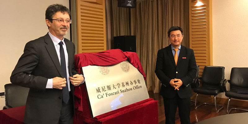 È stato inaugurato lunedì 27 febbraio il Ca' Foscari Suzhou Office a Suzhou University, il primo ufficio di rappresentanza dell’Ateneo veneziano all’estero. All’inaugurazione erano presenti il Rettore di Ca’ Foscari Michele Bugliesi e la Prorettrice e sinologa Tiziana Lippiello.