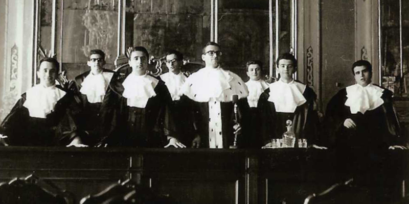 Nella foto è ritratto un gruppo di Cadolfiniani in posa da senatori accademici a Ca' Dolfin (prima metà degli anni Sessanta del Novecento)