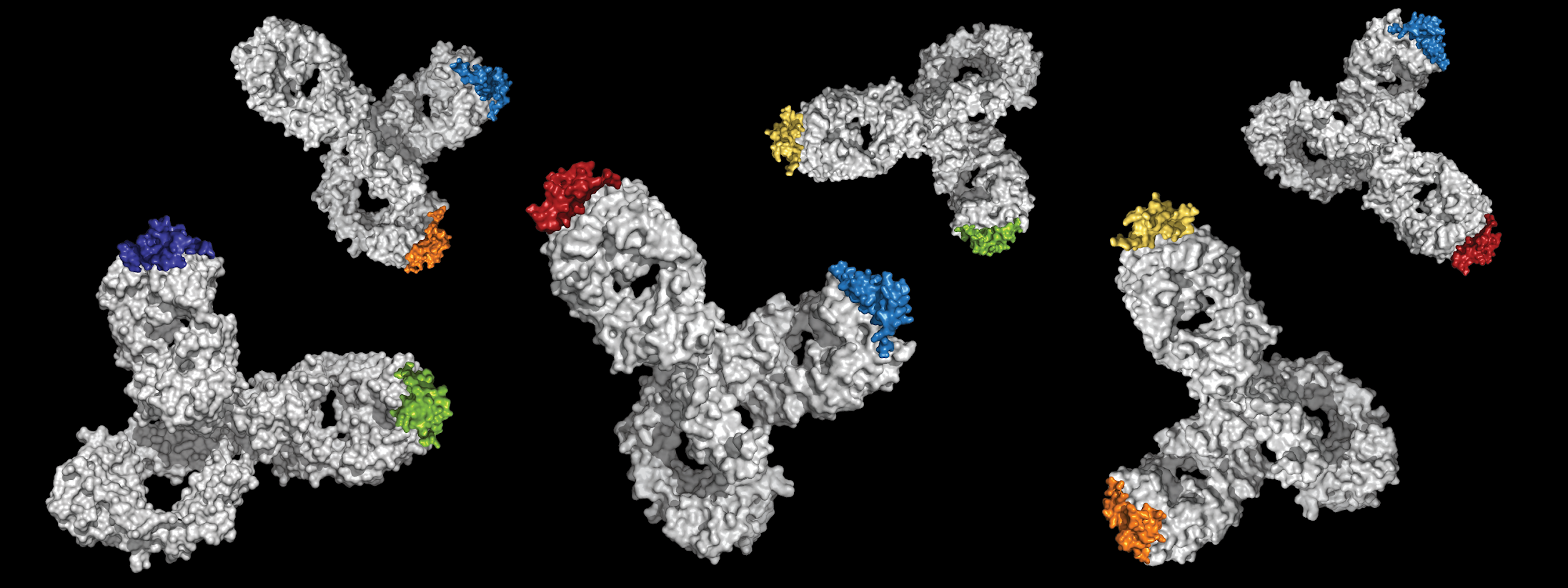 In the picture: 3D models of an engineered antibody (grey) able to bind multiple chemokines (other colors)