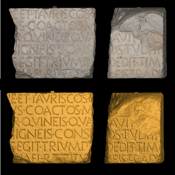 Three-dimensional models of a dedication to Timavo placed in Aquileia by the consul of 129 BC, Gaius Sempronio Tuditano, on the occasion of the triumph over the Giapidi, which was celebrated in Rome following the victorious campaigns against various populations of the eastern Alps, including the Taurisci. Photogrammetric acquisition by V. Macovaz.