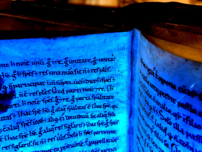 La scriptio inferiore del ms. di C15 riaffiora grazie ad una lampada UV. Padova, Biblioteca Universitaria 2087, f. 4v, particolare. I diritti di riproduzione sono detenuti dalla Biblioteca Universitaria di Padova.