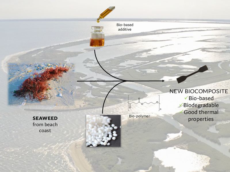 Biocomposite materials emerge as a promising replacement for fossil-based materials, especially if based on biodegradable polymer matrices such as polybutylene succinate (PBS), whose thermomechanical properties are comparable to polypropylene and whose monomers can be bio-based. The addition of natural fillers, derived from waste biomass, can reduce costs, polymer content and modifying the final material's properties. Notably, algae that accumulate as waste along marine coastlines represent a sustainable biomass source to be used as filler. Their growth does not compete with the food supply chain, and their use contributes to the reduction of eutrophication phenomena, while also helping to clean up beach environments.