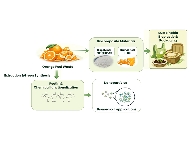 The combined use of agri-food waste in biocomposite engineering and nanostructured delivery systems highlights the versatility of citrus biomass as a sustainable raw material. By integrating waste valorisation with functional polymer design, this approach enables the development of multifunctional materials for biodegradable packaging, antibacterial coatings, and drug delivery platforms. Overall, the results underline the potential of orange peel waste as a key resource for advancing circular economy strategies while delivering both environmental and technological benefits.