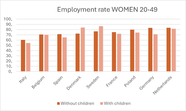 Tra i paesi europei, l’Italia è caratterizzata da uno dei tassi più bassi di occupazione femminile, e le opportunità di occupazione per le donne peggiorano dopo una gravidanza. Se nei paesi UE-27 il tasso di occupazione femminile è del 72,4%, in Italia risulta soltanto del 57,4% (dati 2024). Se consideriamo solo le madri, il tasso di occupazione in Italia scende al 54%. In altre parole, solo una madre su due lavora. Il Piano Nazionale per la Ripresa e Resilienza (PNRR) ha identificato l’espansione dell’assistenza per l’infanzia e la mobilitazione delle energie femminili come azioni politiche necessarie per promuovere l’offerta di lavoro per le donne e per le mamme.
