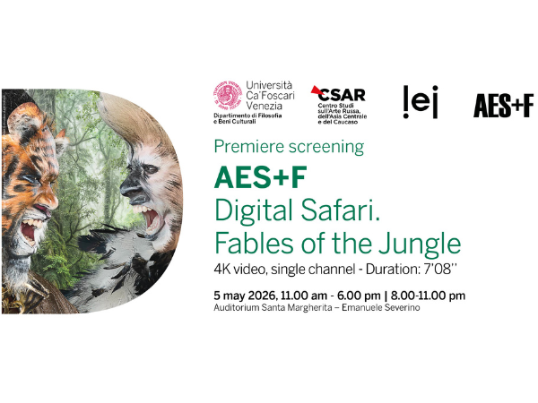 Il 5 maggio 2026 in Auditorium Santa Margherita - Emanuele Severino verrà proiettato in prima assoluta Digital Safari. Fables of the jungle, del collettivo AES+F, uno dei collettivi più influenti dell'arte contemporanea. L'evento è organizzato dallo CSAR e dal Dipartimento di Filosofia e Beni Culturali di Ca' Foscari in collaborazione con il Progetto LEI.