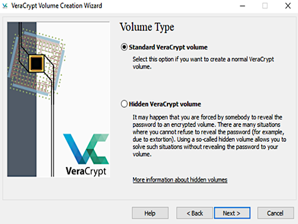 3) A questo punto il software ti chiederà se vuoi creare un contenitore visibile o invisibile (immagine 3). Di norma per il solo scopo di protezione dei file ti basterà scegliere l’opzione default "Standard VeraCrypt volume" e cliccare quindi su "Next".